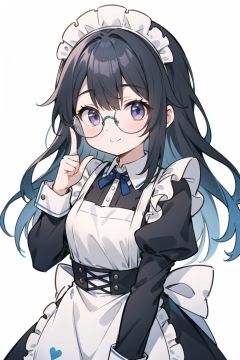 1girl,solo,black hair,glasses,maid,colored inner hair,long hair,maid headdress,multicolored hair,smile,looking at viewer,apron,blush,upper body,simple background,blue hair,black-framed eyewear,bangs,purple eyes,maid apron,dress,finger to mouth,two-tone hair,closed mouth,long sleeves,index finger raised,black dress,white apron,collared dress,grey background,puffy sleeves,frills,white background,hand up,, masterpiece, best quality,