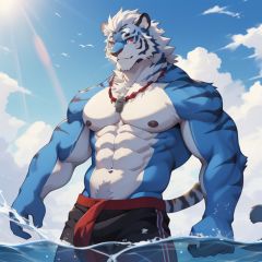 ((masterpiece)),((best quality)),8k,high detailed,ultra-detailed,anime,CG,1boy,sky,water,topless,muscular, tiger boy,blue fur,white hair,blue eyes,red eyes
