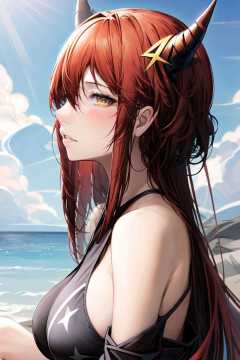 , (masterpiece:1.2), best quality,PIXIV,1girl, solo, surtr (arknights), horns, red hair, long hair, breasts, looking at viewer, swimsuit, bikini, purple eyes, bare shoulders, long sleeves, from side, parted lips, hair rings, detached sleeves, black bikini, outdoors, upper body, official alternate costume, large breasts, star hair ornament, blush, day, hair ornament, star (symbol), bangs, sky, blue sky, hair intakes, looking to the side, sunlight <lora:sketch style_20230721202436:0.9>
