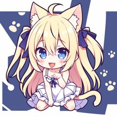 1girl, animal ears, tail, solo, long hair, one side up,dress, blonde hair, tongue, barefoot, paw pose, cat ears, cat tail, tongue out, ahoge, squatting, white dress, simple background, white background, looking at viewer, frilled dress, blue eyes, full body, animal ear fluff, sleeveless dress, cat girl, hair between eyes, bangs, open mouth, paw print, sleeveless, sweat, bare shoulders, spread legs, frills, collarbone, blush, bare legs, smile,
