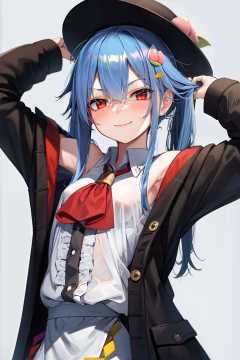 masterpiece, best quality, <lora:tenshihinanawi:1>,1girl, solo, hinanawi tenshi, red eyes, headwear removed, long hair, hat, smile, blue hair, food, hat removed, fruit, black headwear, peach, shirt, holding clothes, looking at viewer, holding, hair ornament, holding hat, center frills, twintails, arms up, hairclip, bangs, closed mouth, frills, white shirt, sleeveless, alternate hairstyle, white background, ascot, long sleeves,jacket, ribbon, blush, upper body, head tilt, leaf, open clothes, sleeveless shirt, black jacket, buttons, hair between eyes, collared shirt, black ribbon, wing collar, red ascot, coat, off shoulder, hair ribbon, armpits, sidelocks, puffy sleeves, bow, open jacket, black coat, adapted costume, skirt, border