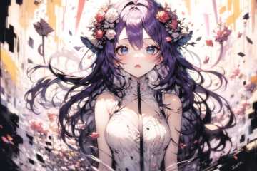 masterpiece, best quality, 1girl, cowboy shot, (flowers:1.15), (sketchy, jaggy lines:1), purple hair, blue eyes