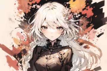 masterpiece, best quality, 1girl, upper body, (flowers:1.15), flat color, watercolor, pencil, (sketch, jaggy lines:1.4), white hair, black eyes
