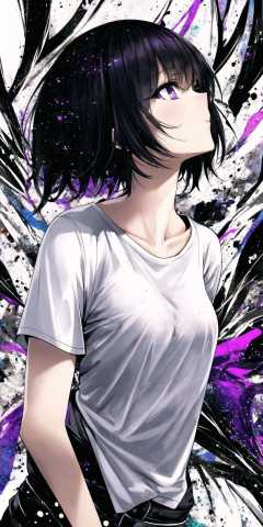 masterpiece, best quality, 1girl, upper body, shirt, black hair, purple eyes, abstract