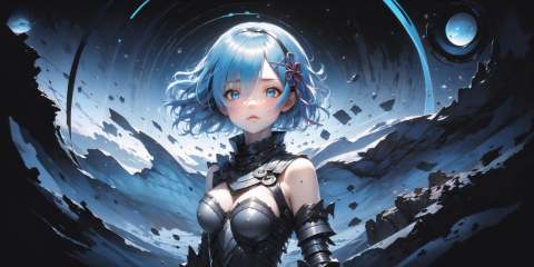 masterpiece, best quality, rem, 1girl, (armor, metal, black hole, powerful, abstract:1.2), (blue theme:1.5), (exile:1.15), (machine:1.25)<lora:Rembooru_789677:1>