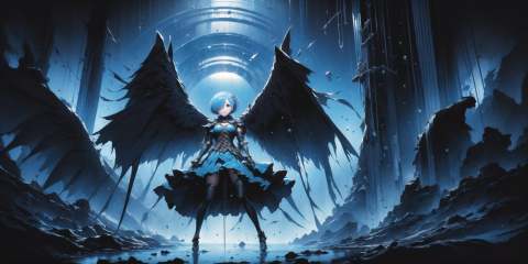 masterpiece, best quality, rem, 1girl, (armor, metal, black hole, powerful, abstract:1.2), (blue theme:1.5), (portal:1.2), wings<lora:Rembooru_789677:1>