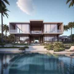 (masterpiece),(high quality), best quality, real,(realistic), super detailed, (full detail),(4k),8k,no humans, scenery, tree, reflection, plant, sky, building, outdoors, palm tree, window, water, cloud, reflective water, potted plant <lora:XSArchi_109PoolHouse泳池独栋正视角:1>