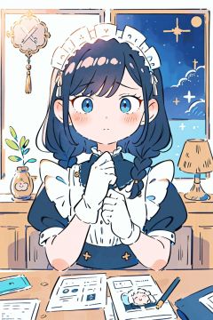 Masterpiece, best quality, sense of design, (poster design), (front) girl, black pupil, in the dark, big eyes, black braids, white gloves, white maid headdress, black and white maid dress, holding candlestick, puzzled expression, only the upper body, bust,fairy tale girl