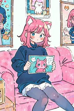 Masterpiece, best quality, (sense of design), poster ((poster design)) (front) room, window, girl sitting on sofa, short pink hair, a pair of fluffy cat ears, black sweater, white pantyhose