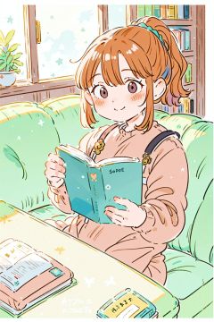 1girl, plant, book, cat, brown hair, sitting, bookshelf, potted plant, solo, ponytail, indoors, dress, smile, feet out of frame, couch, long sleeves, window, open book, reading, bangs, black eyes, short hair, closed mouth, holding, animal