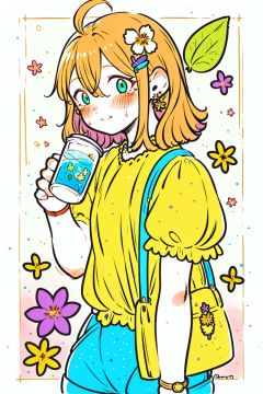 blue flower, 1girl, watch, wristwatch, hair ornament, flower, shirt, brown hair, hair between eyes, blush stickers, solo, holding, short hair, green eyes, drinking straw, short sleeves, bag, food, morning glory, cup, bangs, hairclip, fruit, shoulder bag, fish hair ornament, holding cup, cowboy shot, purple flower, plant, cat hair ornament, drinking, hands up, drink, leaf, lemon, shorts, jewelry, orange shirt, t-shirt, ice cube, blush, yellow shirt, drinking glass, standing, closed mouth, ahoge, lemon slice, looking at viewer, indoors, mole under eye, sunlight, day,