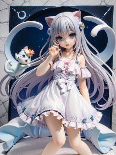 {{masterpiece}},hair ornament,loli,a girl,Poor milk,flat breast,white long hair,grey hair,cat ears,blue eyes,cat tail,nacho,handmade style,long_hair,night dress,