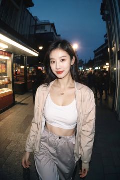 Negative prompt: (masterpiece, best quality, high quality, highres, ultra-detailed),(slim:1.1) beautiful,woman, looking into camera, (fisheye lens:1.3),candid photograph, photo-realistic, (film grain:1.4), (masterpiece:1.2), sharp image,analog style,award winning photo, best quality,(shot with kodak 400:1.3), sharp,skin pores,Big Breasts,8k, best quality, masterpiece:1,2), (realistic, photo-realistic:1,37), top quality, masterpiece, a beautiful woman, wearing a shirt for women crop v neck top white t-shirt korean fashion women t with a tight open gray color jacket, beautiful and toned body, cleavage, floral mini skirt, walking in the suburbs, slightly drizzling night background, in shops with Korean-style shop lights, night atmosphere, slightly wet asphalt, seductive smiles with dimples,,