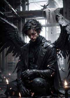 BJ_Daemon, solo, smile, short_hair, shirt, black_hair, gloves, long_sleeves, 1boy, sitting, closed_mouth, jacket, closed_eyes, male_focus, wings, black_gloves, pants, indoors, black_footwear, black_jacket, halo, black_pants, own_hands_together, feathers, feathered_wings, facing_viewer, black_wings, angel_wings, angel, candle, praying, black_feathers,cinematic lighting,strong contrast,high level of detail,Best quality,masterpiece,White background,<lora:Daemon:0.7>,