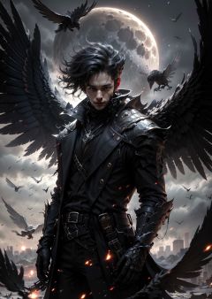 BJ_Daemon, solo, looking_at_viewer, short_hair, black_hair, gloves, 1boy, closed_mouth, standing, male_focus, wings, black_gloves, belt, coat, bird, moon, full_moon, black_wings, black_coat, crow, black_feathers,cinematic lighting,strong contrast,high level of detail,Best quality,masterpiece,White background,<lora:Daemon:0.7>,