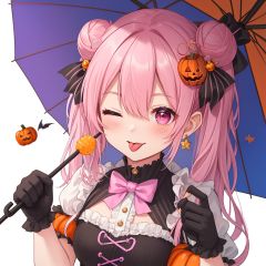 taya, 1girl, maruyama aya, solo, tongue out, pink hair, tongue, bow, one eye closed, gloves, polka dot, polka dot bow, candy hair ornament, hair bun, star (symbol), jewelry, upper body, pink eyes, bowtie, double bun, purple gloves, earrings, blush, bangs, hair ornament, umbrella, short sleeves, holding, food-themed hair ornament, looking at viewer, ;q, head wings, halloween, ribbon, striped, food, black bow, jack-o'-lantern, candy, frills, index finger raised, wings, hair bow, halloween costume, smile, lollipop, hair ribbon, frilled gloves, frilled sleeves, black bowtie, ;p, long hair, alternate hairstyle, pumpkin hair ornament, striped bow, holding umbrella, food-themed earrings, masterpiece, best quality,