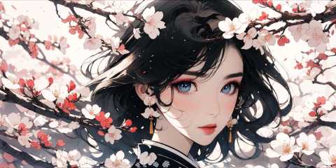 (masterpiece:1.2), best quality,PIXIV, Chinese ink painting,ink wash painting, solo, branch, black hair, 1girl, eyelashes, eyeshadow, cherry blossoms, looking at viewer, portrait, blue eyes, makeup, flower, close-up, covered mouth, dappled sunlight, pink flower, bangs, short hair, eyeliner, petals <lora:Chinese ink painting_20230725110925-000018:0.9>