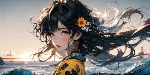 (masterpiece:1.2), best quality,PIXIV,Chinese ink painting,ink wash painting,1girl, solo, long hair, black hair, looking at viewer, flower, yellow dress, upper body, yellow flower, earrings, floating hair, blush, jewelry, brown eyes, parted lips, water, dress, floral print, from side, bubble, long sleeves, breasts, very long hair <lora:Chinese ink painting_20230725220724-000018:1>