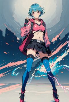 sssr,((masterpiece)),((best quality)),8k,high detailed,ultra-detailed,1girl, full body, standing, pink eyes,solo, looking at viewer,short hair,blue hair, closed mouth, skirt, medium breasts, black gloves, pleated skirt, belt, High-heeled shoes, skin tight,sling, taut clothes, ar-15 ,Electric arc, <lora:sssrV5-000001:0.8>