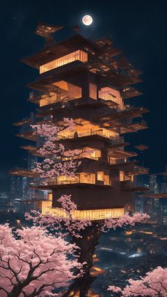 sky city,building floating on air,waterfall  , (((masterpiece,best quality))),((good structure,Good composition,good atomy)), ((clear, original,beautiful)),see color,night,moon,pink Cherry blossom tree In the city