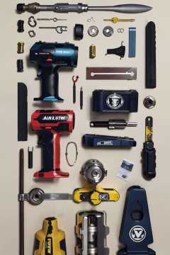 no_humans, weapon, english_text, gun, knife, handgun, watch, handcuffs, bullet, magazine_\(weapon\), still_life, knolling+laydown <lora:laydown:1>