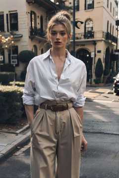 belt, blurry, building, christmas, christmas_tree, city, city_lights, photo_background, realistic, skyscraper, solo, tree, shirt, black_hair, 1boy, standing, white_shirt, male_focus, cowboy_shot, collared_shirt, pants, shirt_tucked_in, brown_pants, old money<lora:old money:1>