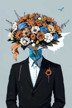 bee, blue_butterfly, bug, butterfly, flower, solo, white_butterfly, yellow_butterfly, simple_background, shirt, 1boy, jacket, monochrome, upper_body, male_focus, collared_shirt, leaf, formal, suit, bouquet, holding_bouquet, orange_flower, object heads, flower as head <lora:ob head:1>