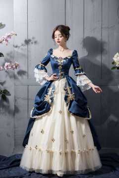 1girl, dress, solo, brown_hair, jewelry, standing, full_body, closed_eyes, earrings, hair_bun, blue_dress, victorian <lora:vic:0.8>