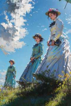 1girl, blonde_hair, blue_eyes, field, flower, grass, hat, mountain, outdoors, plant, scenery, short_hair, multiple_girls, long_sleeves, dress, holding, 2girls, sky, day, cloud, white_dress, blue_sky, umbrella, holding_umbrella, impressionist <lora:impress:1>