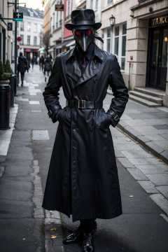 black_coat, black_footwear, black_headwear, boots, buttons, coat, hand_on_hip, hat, solo, standing, medieval street, 1boy, full_body, male_focus, belt, mask, facing_viewer, hands_in_pockets, long_coat, fedora, trench_coat, Plaguecore, outfit<lora:Plaguecore:0.7>