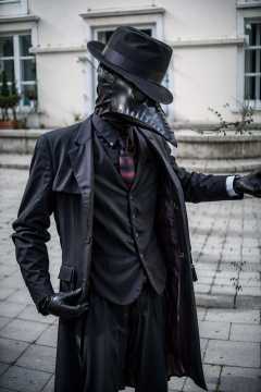 black_headwear, blurry, formal, hat, suit, tiles, solo, shirt, gloves, 1boy, holding, jacket, male_focus, necktie, black_gloves, pants, black_jacket, mask, black_pants, fedora, black_suit, Plaguecore, outfit <lora:Plaguecore:1>