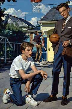 3boys, glasses, multiple_boys, pants, brown_hair, shirt, jacket, male_focus, necktie, shoes, striped, bag, english_text, parody, formal, suit, t-shirt, sneakers, 6+boys, jeans, striped_shirt, basketball, vintage ad style<lora:ad:1>