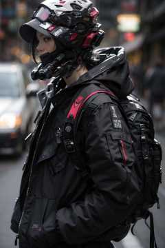 (realistic:1.2),1girl, blurry, blurry_background, depth_of_field, helmet, solo, jacket, upper_body, hood, bag, from_side, black_jacket, profile, mask, backpack, urban techwear, outfit<lora:urbantechwear:1:OUTD>