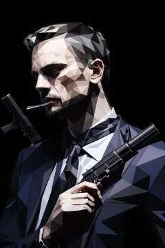 checkered, solo, simple_background, shirt, 1boy, holding, jacket, white_shirt, upper_body, weapon, male_focus, necktie, collared_shirt, holding_weapon, gun, facial_hair, formal, suit, black_background, holding_gun, beard, handgun, smoke, low ploy<lora:low:1>