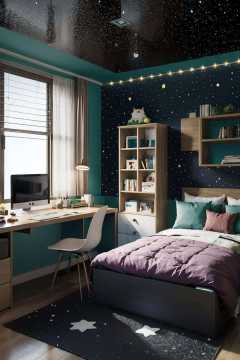 american_flag, box, christmas_ornaments, christmas_tree, constellation, curtains, indoors, night, night_sky, shooting_star, sky, space, star_print, starfish, starry_background, starry_sky, starry_sky_print, window, pillow, no_humans, bed, chair, desk, clock, lamp, computer, bedroom, monitor, poster_\(object\), trash_can, calendar_\(object\), room2<lora:room2:1>