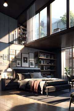 bookshelf, couch, indoors, plant, potted_plant, window, day, pillow, book, no_humans, bed, table, sunlight, curtains, scenery, wooden_floor, lamp, bedroom, room2<lora:room2:1>