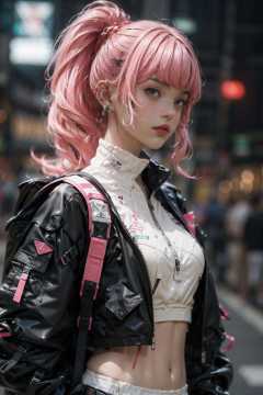(realistic:1.2),1girl, backpack, bangs, blurry, blurry_background, depth_of_field, earrings, hair_ornament, jewelry, piercing, pink_hair, solo, long_hair, breasts, long_sleeves, navel, closed_mouth, jacket, upper_body, ponytail, midriff, bag, lips, crop_top, grey_eyes, ear_piercing, zipper, freckles, strap, urban techwear, outfit<lora:urbantechwear:1.2:OUTD> <lora:A素体机娘:0.4>