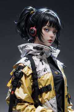 (realistic:1.2),1girl, bandaid, black_hair, dirty, grey_background, headphones, headset, short_hair, solo, breasts, bangs, blue_eyes, simple_background, long_sleeves, medium_breasts, jacket, upper_body, ponytail, small_breasts, lips, see-through, torn_clothes, facial_mark, yellow_jacket, urban techwear, outfit <lora:urbantechwear:1>