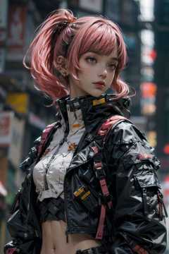 (realistic:1.4),1girl, backpack, bangs, blurry, blurry_background, depth_of_field, earrings, hair_ornament, jewelry, piercing, pink_hair, solo, long_hair, breasts, long_sleeves, navel, closed_mouth, jacket, upper_body, ponytail, midriff, bag, lips, crop_top, grey_eyes, ear_piercing, zipper, freckles, strap, urban techwear, outfit<lora:urbantechwear:1> <lora:A素体机娘:0.3>