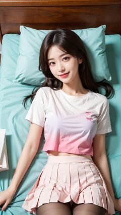 1girl,cute & girly \(idolmaster\),lying in bed,Lie on your back,print_shirt,smile,pink style,(pantyhose, white pleated skirt),gradient hair,gradient eyes,gradient clothes,