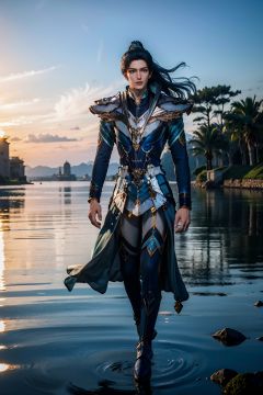 masterpiece,best quality,1boy,armor,upper ,Walking by the seaside,dermatoglyph,whole body,solo, detailed face and eyes,realistic,1 girl,long legs,(long derss:2),BJ_Daemo