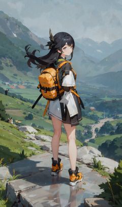 1girl,outdoors,gloden trim,light smile,sidelighting,looking back,hike,standing on mountaintop,<lora:agv2:1>