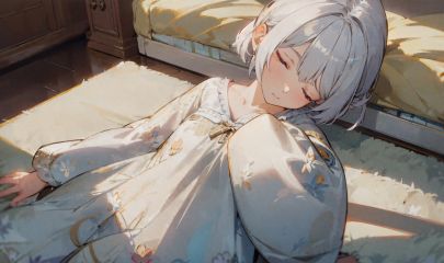 wide shot,(upside-down:0.7),1girl,half-closed eyes,on back,sleepwear,bed,head tilt,expressionless,from above,looking to the side,warm tone,indoors,living room,<lora:agv201:1>