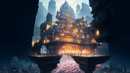 sky city,building floating on air,(((masterpiece,best quality))),((good structure,Good composition,good atomy)), ((clear, original,beautiful)),see color(floating:1.2),plant,giant flowers,Fractal,QTQI