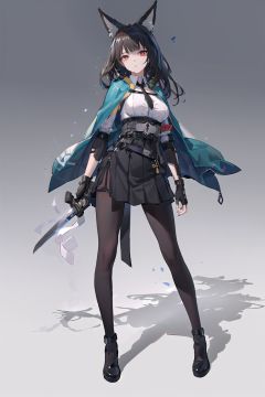 masterpiece), (best quality),(illustration),(ink:1.2), (Ultra detailed original illustration),8k wallpaper,Amazing finely detail, tachi-e,(extremely CG ,best quality),(best illumination,best shadow),,(low contrast:0.9),(contrast colour:0.9),ya, 1girl, solo, weapon, long hair, animal ears, red eyes, pantyhose, holding, sword, black hair, holding weapon, simple background, skirt, holding sword, katana, full body, gloves, animal ear fluff, fox ears, capelet, bangs, looking at viewer, black skirt, black footwear, brown pantyhose, <lora:ya-v100:0.75:char>,(beautiful_face), ((intricate_detail)), (revealing clothes:1.2),((finely_detailed)),fine_fabric_emphasis,((glossy)),
