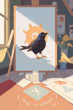 (art by Anne McCaffrey:0.7) , Drawing, best quality, eye-level shot of a Blackbird, from inside of The Four Corners Monument, Screen print, "I'm a superstar, I'm a superstar, I'm a superstar."