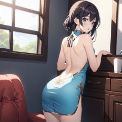 ((Anime)),((Game CG)), ((Illustration)),1 girl, backless cheongsam, buttocks, living room, window view,((Paintings)),((imagery))