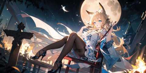 (masterpiece:1.2), best quality,PIXIV, backlight,dark theme,1girl, long hair, night, solo, moon, fire, blonde hair, sitting, outdoors, high heels, animal ears, night sky, sky, dress, pantyhose, full moon, chair, blue eyes, campfire, full body, looking at viewer, star (sky), staff, horns, black footwear <lora:dreamlike_20230727145343-000018:0.8>