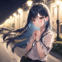 best quality, masterpiece,1girl,face focus,blue hair, long hair,brown eyes, Hair between eyebrowswhite shirt,Hold your cheeks with both hands,outdoors,Parks, streetlights,windy,floating hair,night,