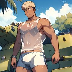 1boy,topless, undercut,summer,dark skin,white hair,white eyes, see-through **** top, boxer briefs,muscular,facial hair,stubble,